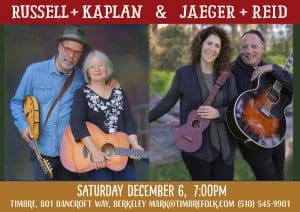 We’re delighted to welcome two beloved Bay Area duos—Claudia Russell + Bruce Kaplan and Judi Jaeger + Bob Reid—for an evening of harmony-rich, heartfelt folk music here at Timbre. Each duo will play its own set, and then they’ll join forces for a few shared songs and a couple of surprise covers.